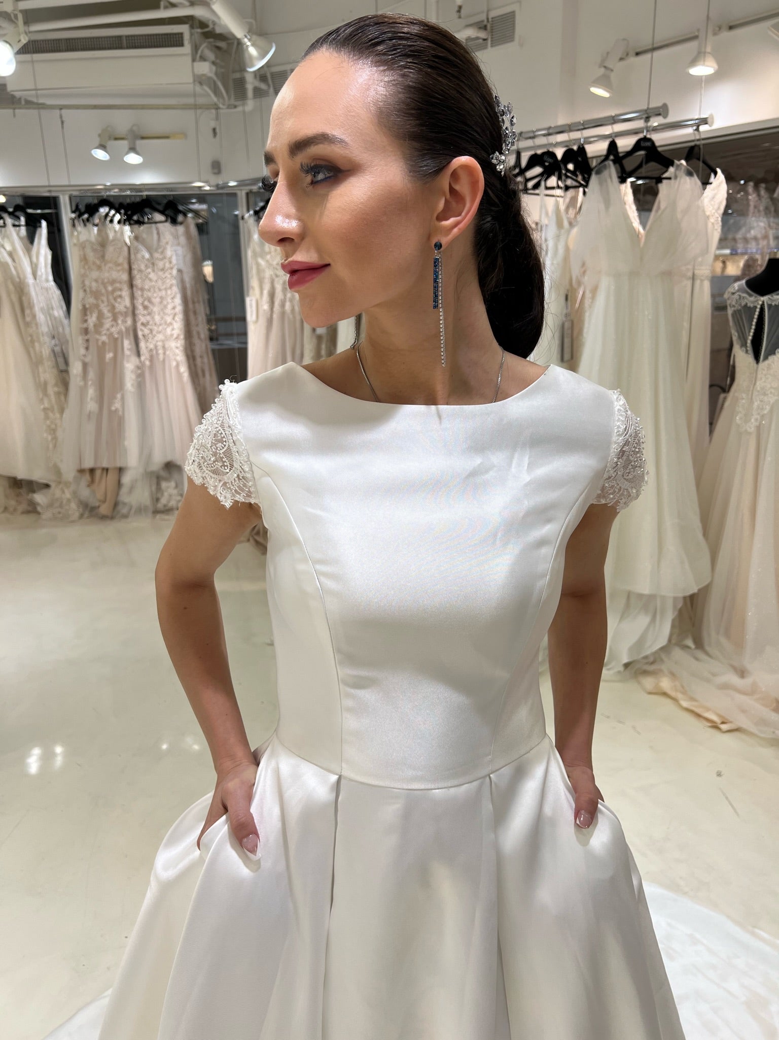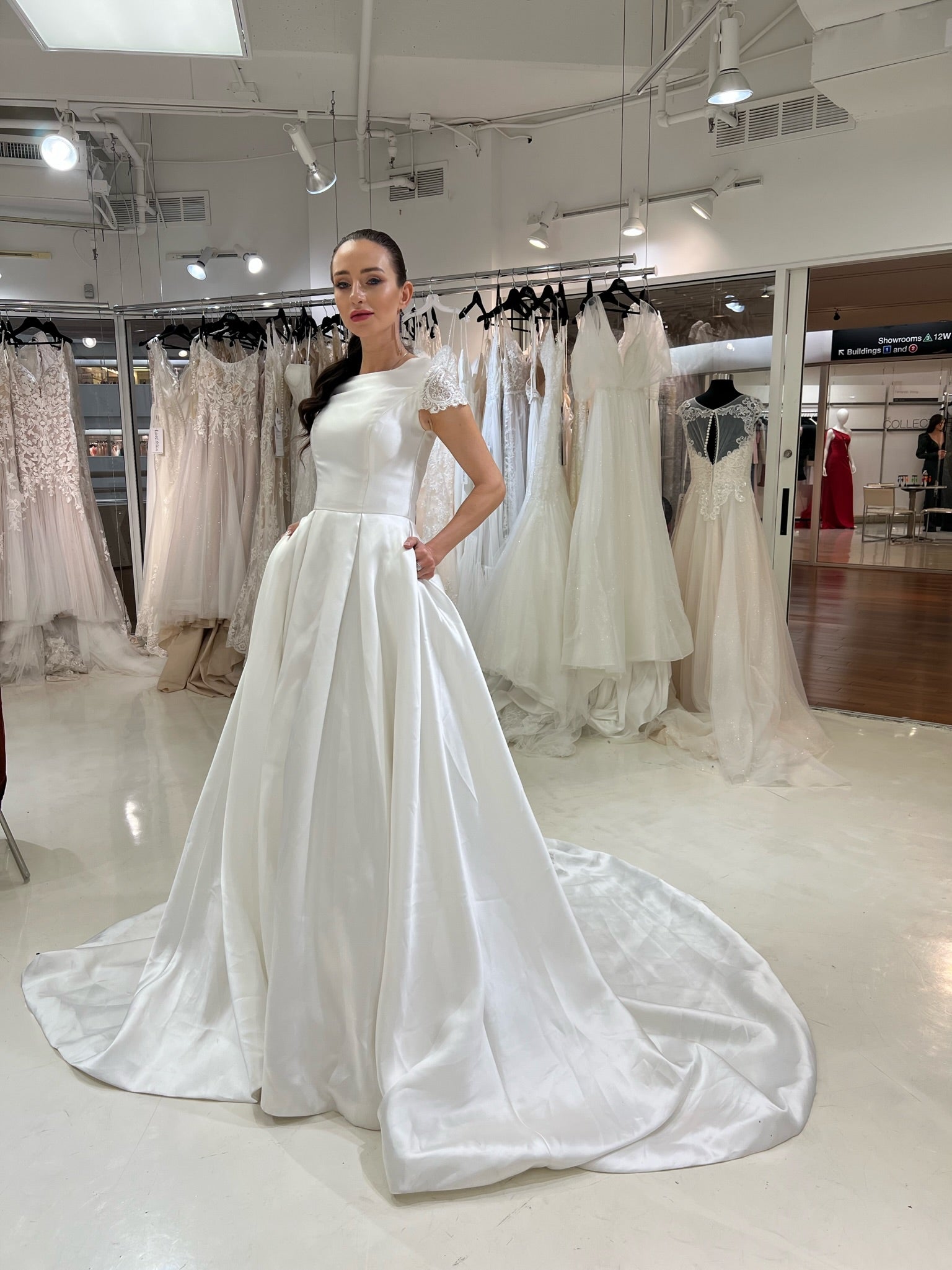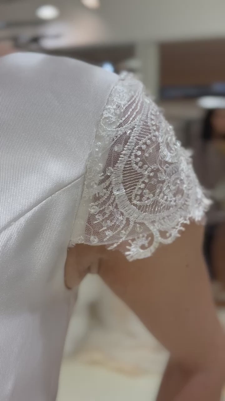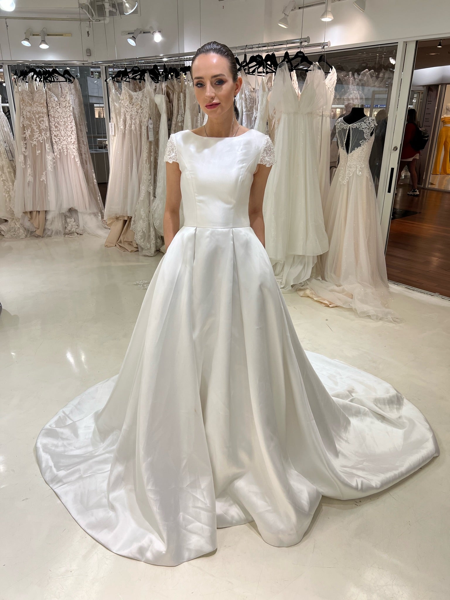 All gowns are authentic designer and private label gowns. While we do our best to take good care for our sample gowns, please note that normal wear & tear is expected. These are in-store samples that have been tried on in-store by brides, but have never been used, worn or altered in any way. Minor fixes and/or cleaning may be expected, however, any major damage will be explicitly stated in the item’s description. If you have any questions prior to purchasing, please reach out to us directly.