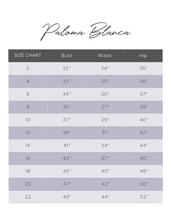 Please note that bridal sizes run small. Your bridal size will usually be several sizes larger than your typical street size, depending on the designer. Please measure yourself and compare it to the designer’s size chart before placing an order. If you are in between sizes, always size up, as you can typically alter a wedding gown 1-2 sizes down in alterations without any structural changes to the gown. Just like any formalwear, alterations are typically necessary for the dress to fit like a glove.
