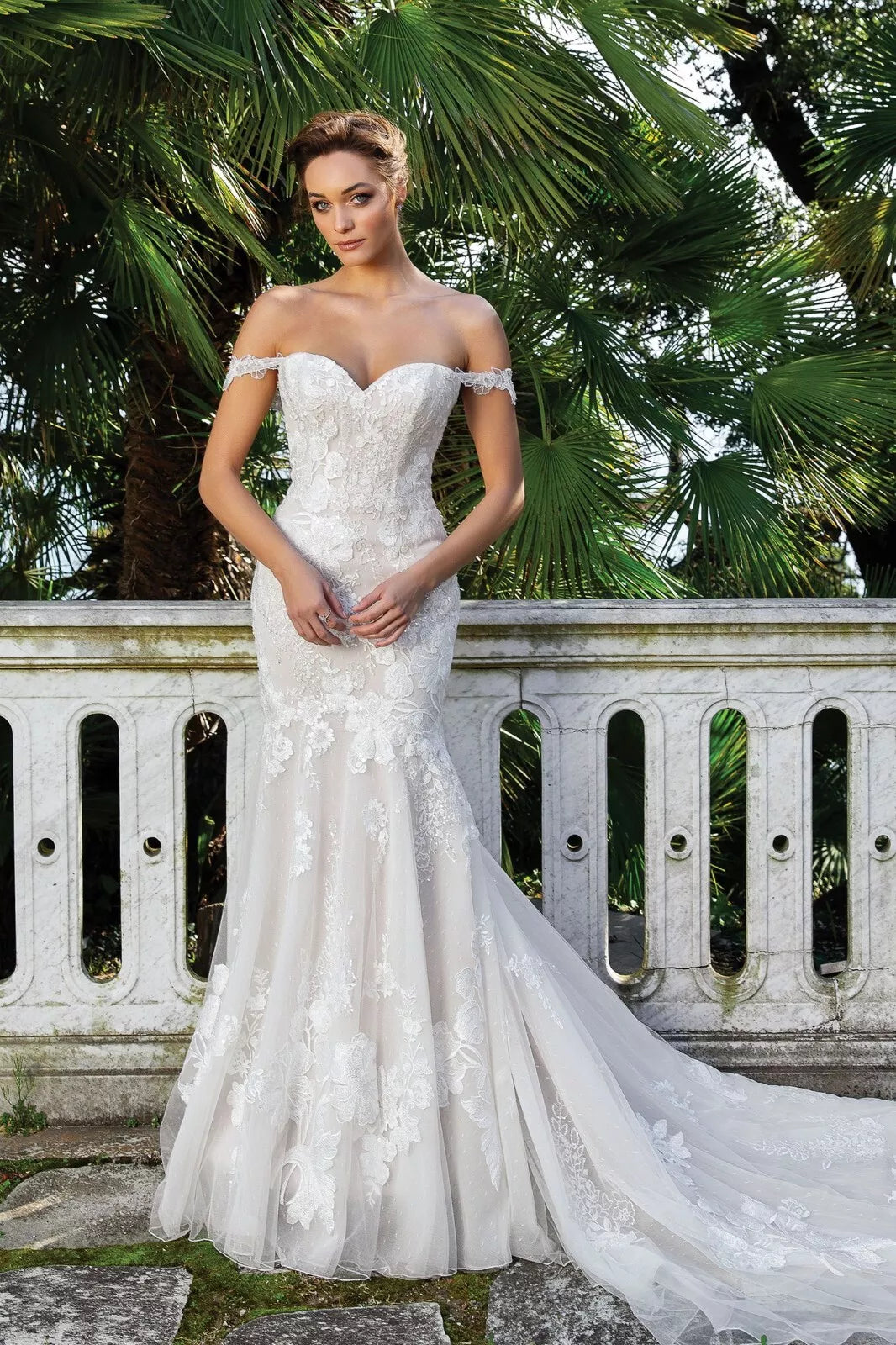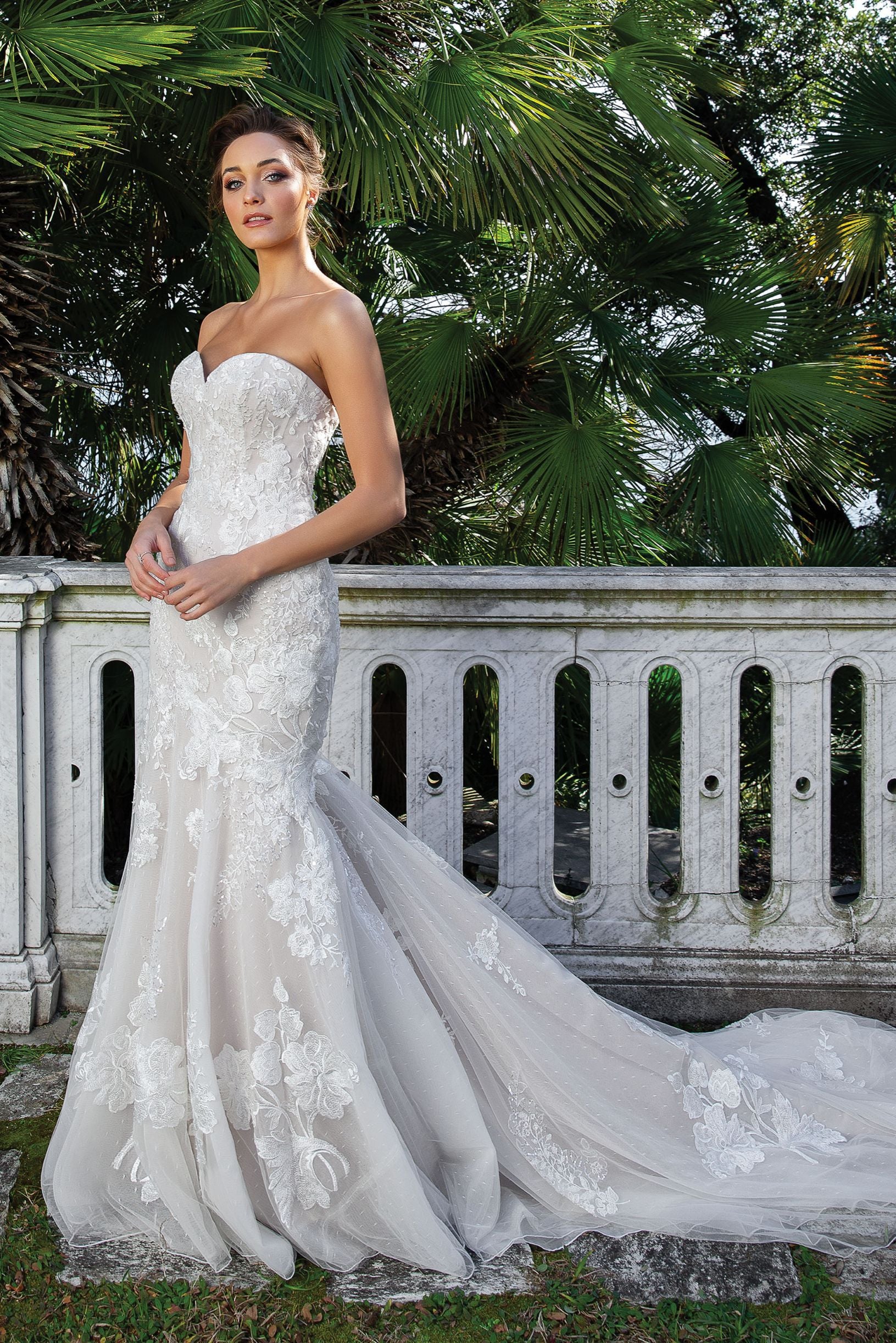 This Venice lace and Point D'esprit fit and flare gown is the epitome of timeless romance. The lace straps at the neckline are detachable. The fitted silhouette features allover lace details and a chapel length train.