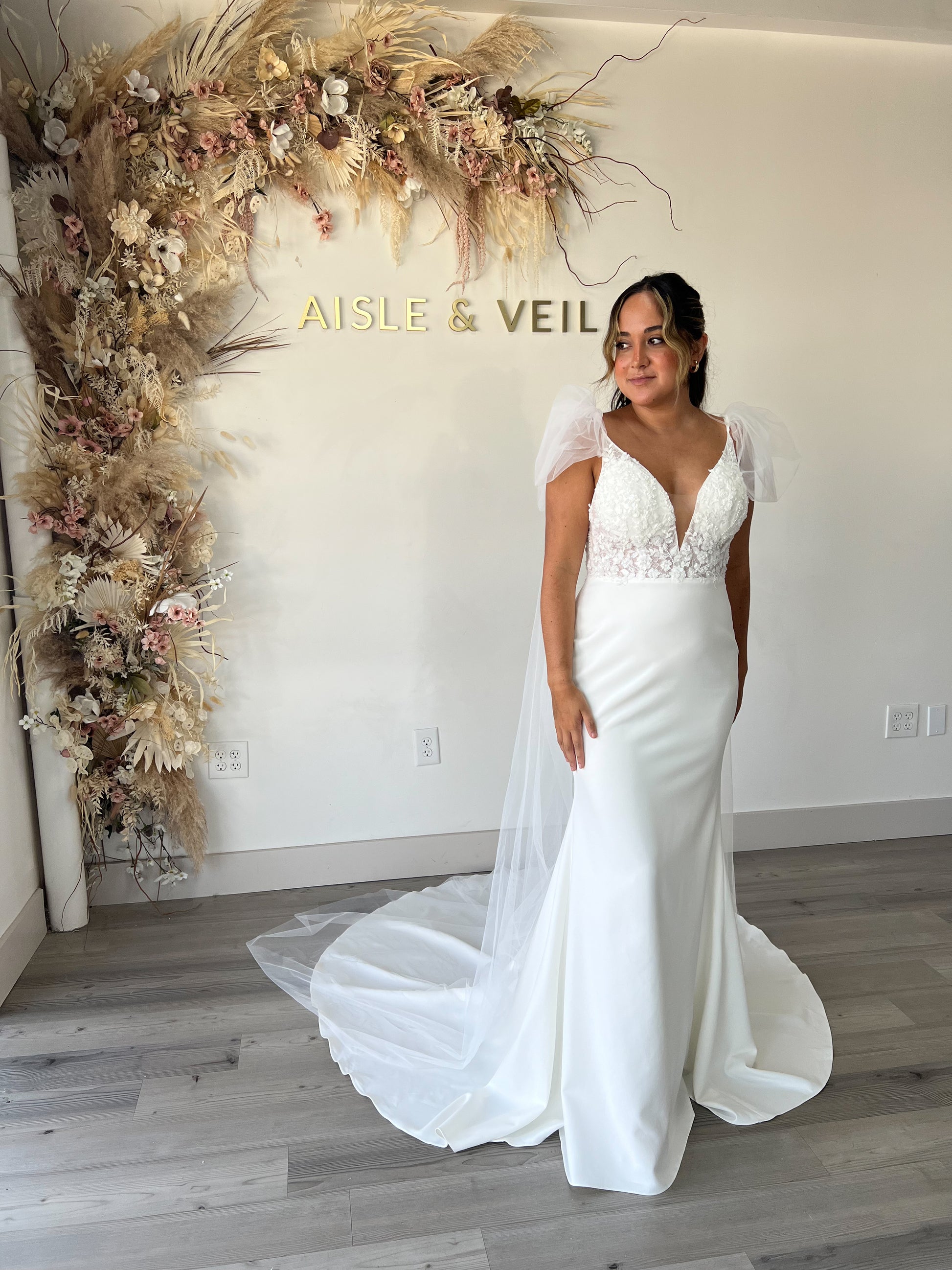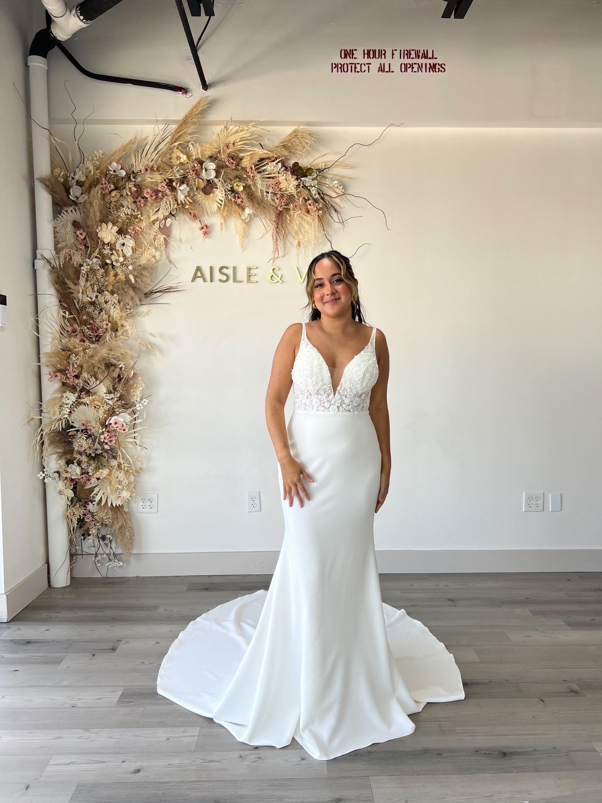 All gowns are authentic designer and private label gowns. While we do our best to take good care for our sample gowns, please note that normal wear & tear is expected. These are in-store samples that have been tried on in-store by brides, but have never been used, worn or altered in any way. Minor fixes and/or cleaning may be expected, however, any major damage will be explicitly stated in the item’s description. If you have any questions prior to purchasing, please reach out to us directly.