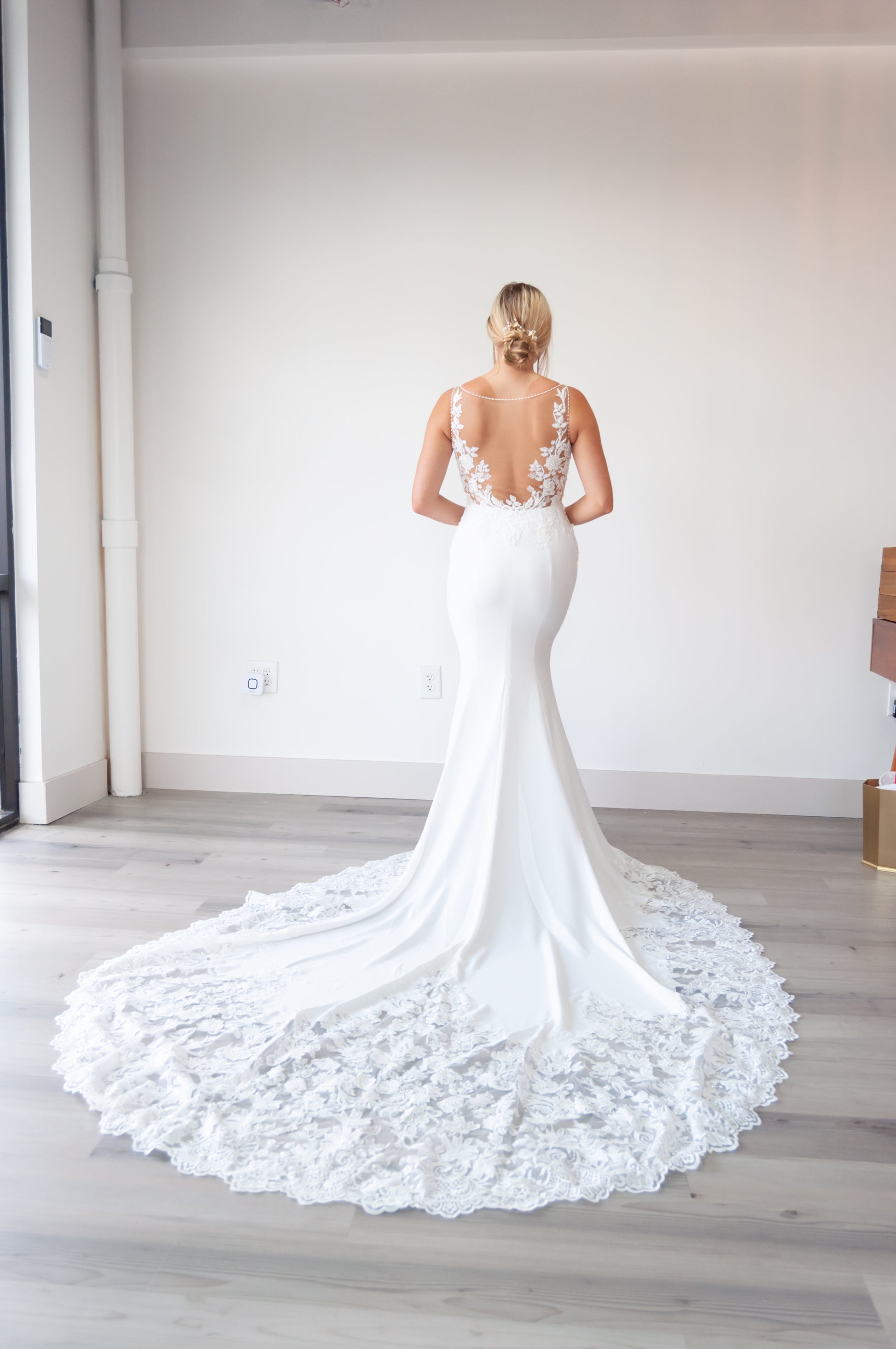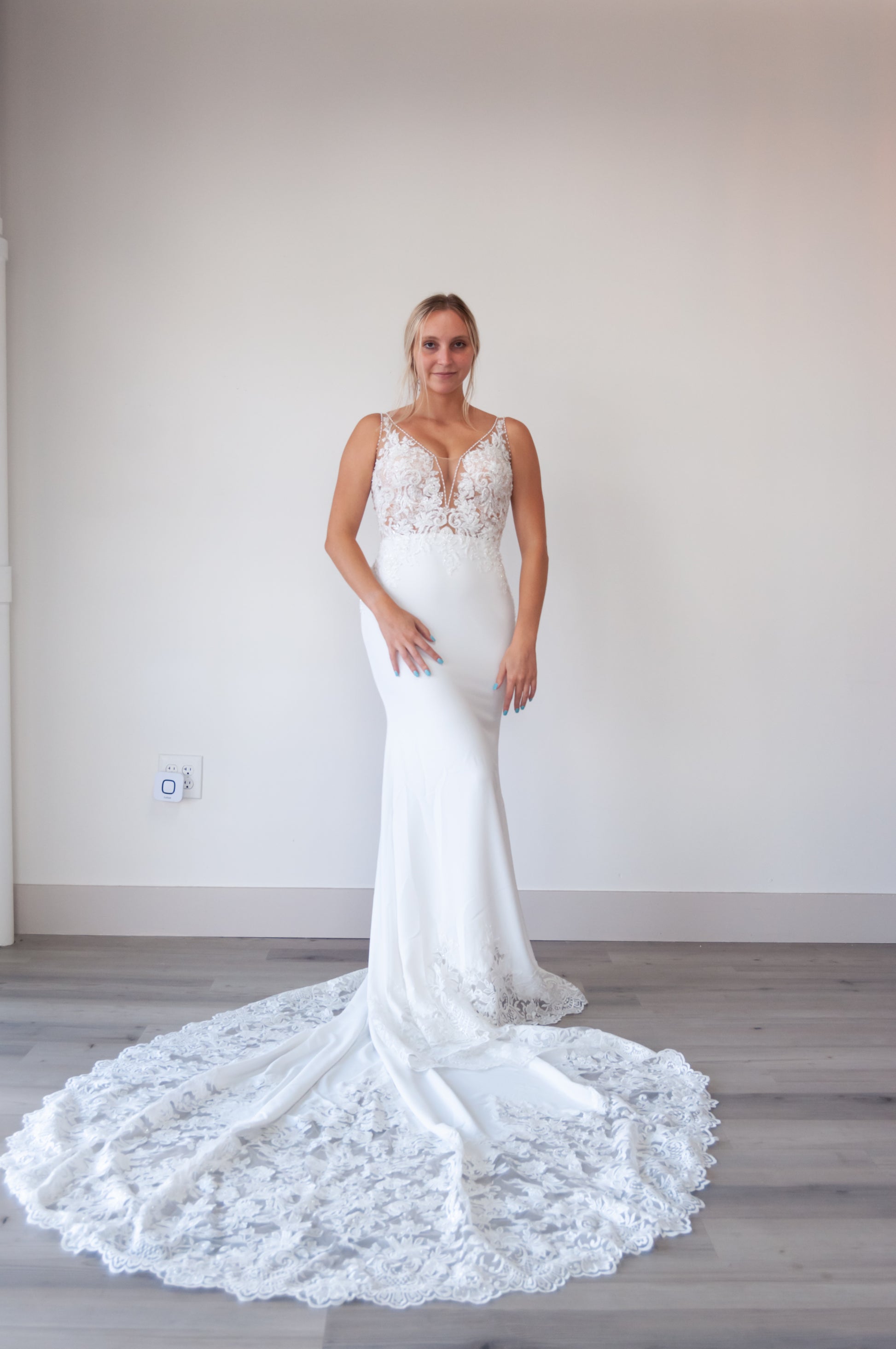 All gowns are authentic designer and private label gowns. While we do our best to take good care for our sample gowns, please note that normal wear & tear is expected. These are in-store samples that have been tried on in-store by brides, but have never been used, worn or altered in any way. Minor fixes and/or cleaning may be expected, however, any major damage will be explicitly stated in the item’s description. If you have any questions prior to purchasing, please reach out to us directly.