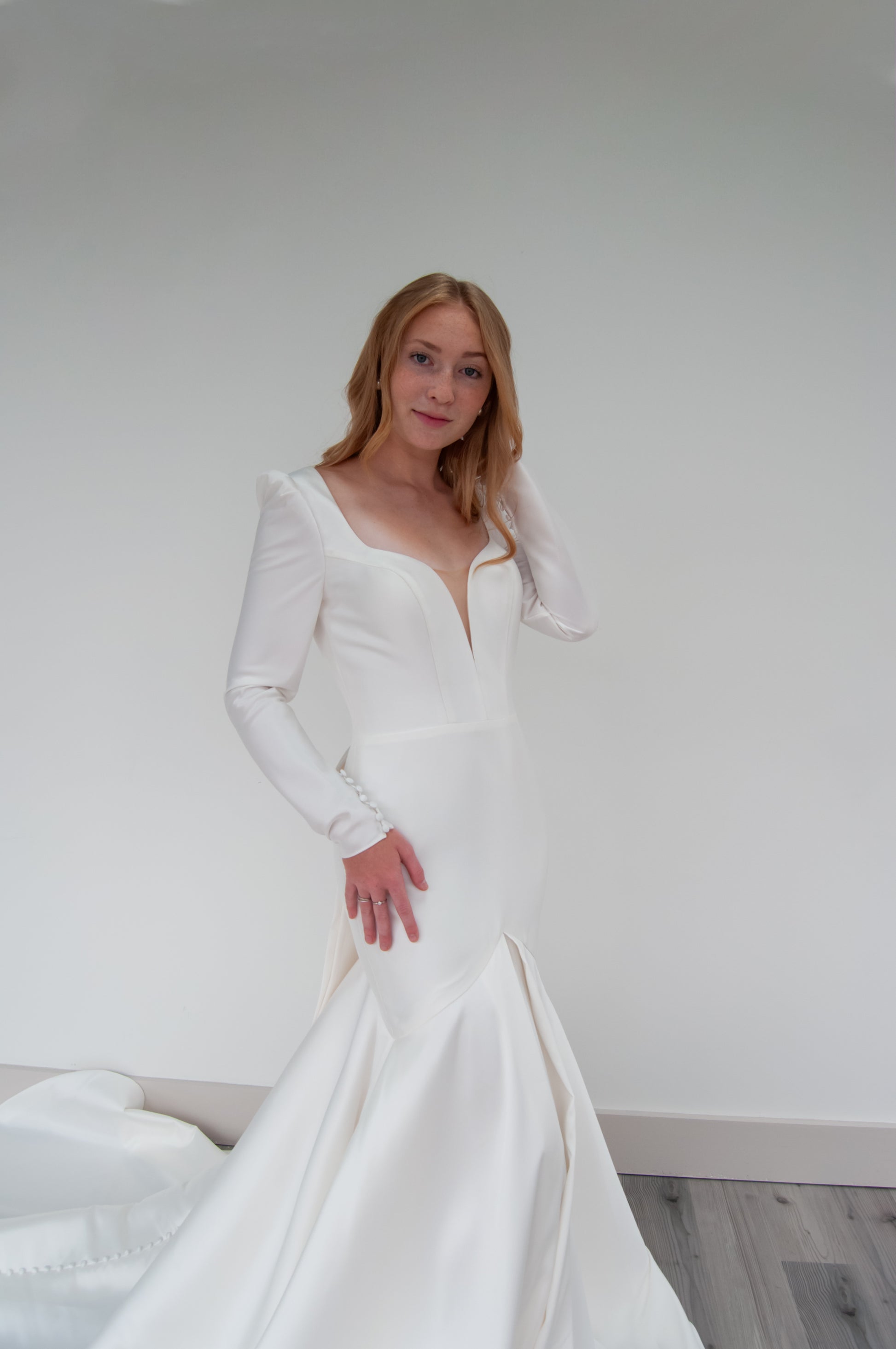 All gowns are authentic designer and private label gowns. While we do our best to take good care for our sample gowns, please note that normal wear & tear is expected. These are in-store samples that have been tried on in-store by brides, but have never been used, worn or altered in any way. Minor fixes and/or cleaning may be expected, however, any major damage will be explicitly stated in the item’s description. If you have any questions prior to purchasing, please reach out to us directly.