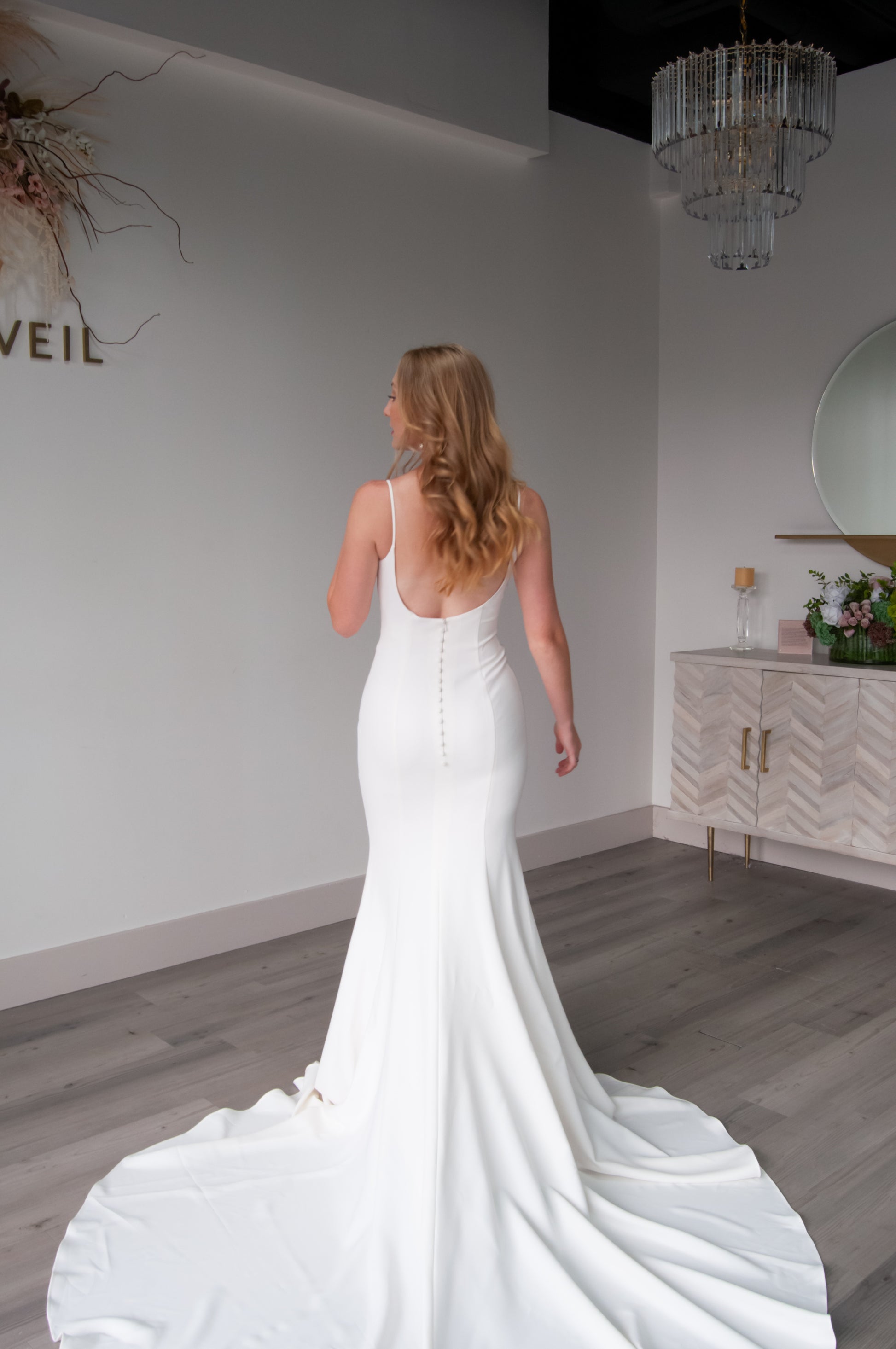 All gowns are authentic designer and private label gowns. While we do our best to take good care for our sample gowns, please note that normal wear & tear is expected. These are in-store samples that have been tried on in-store by brides, but have never been used, worn or altered in any way. Minor fixes and/or cleaning may be expected, however, any major damage will be explicitly stated in the item’s description. If you have any questions prior to purchasing, please reach out to us directly.