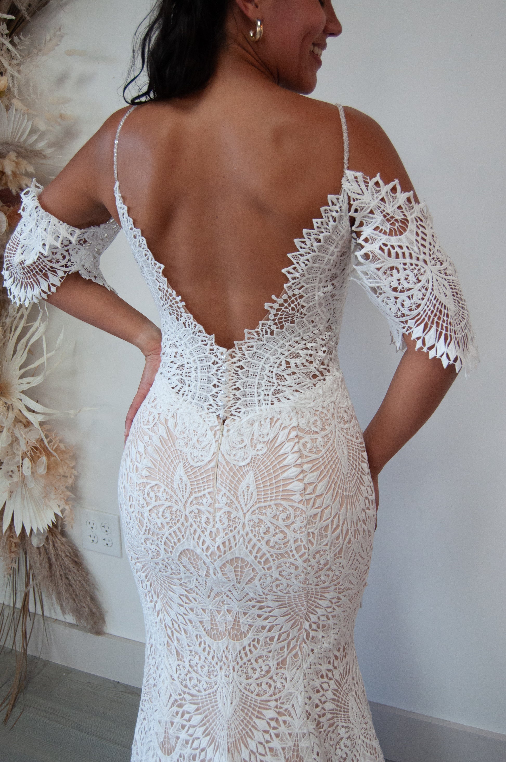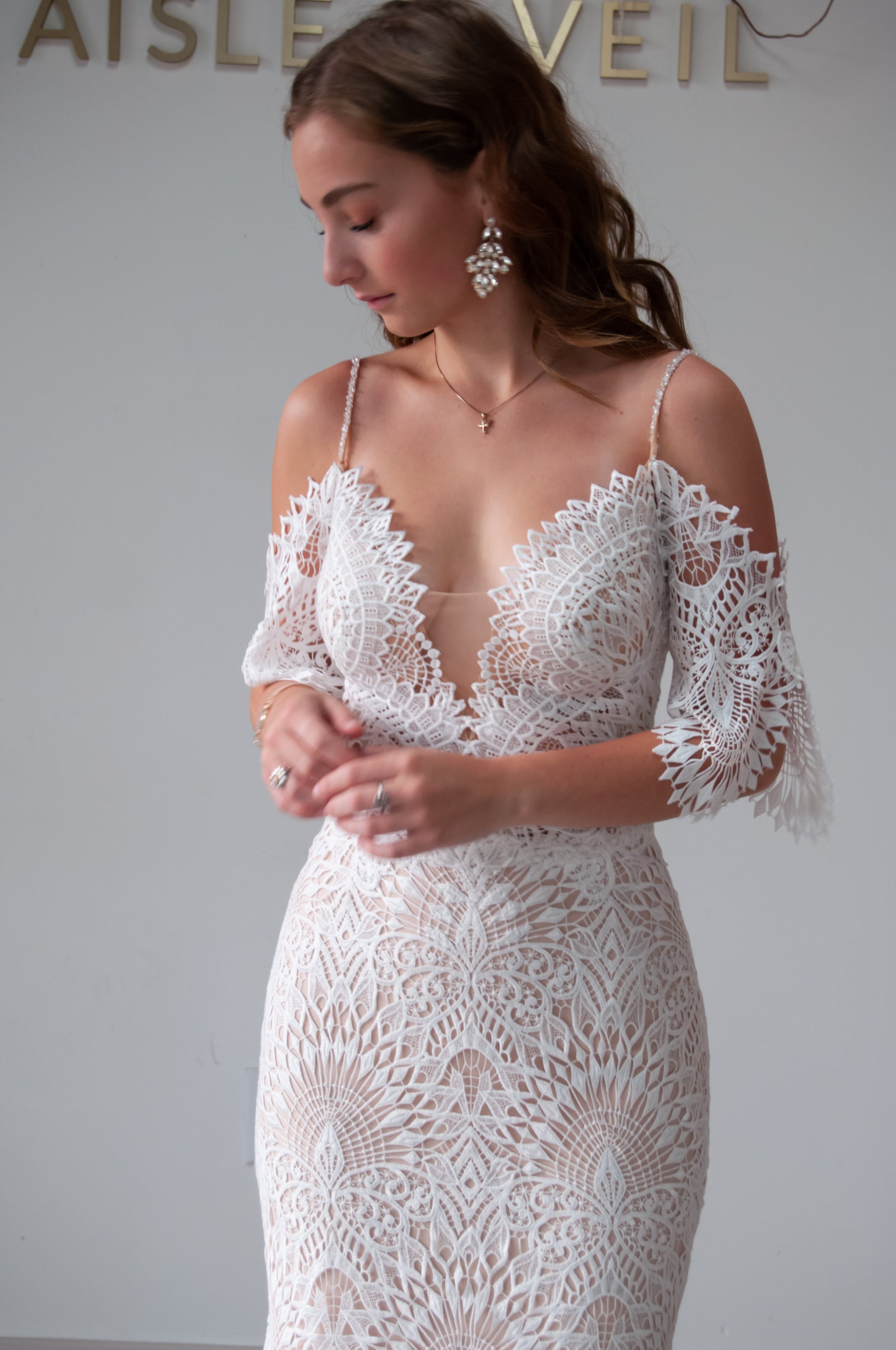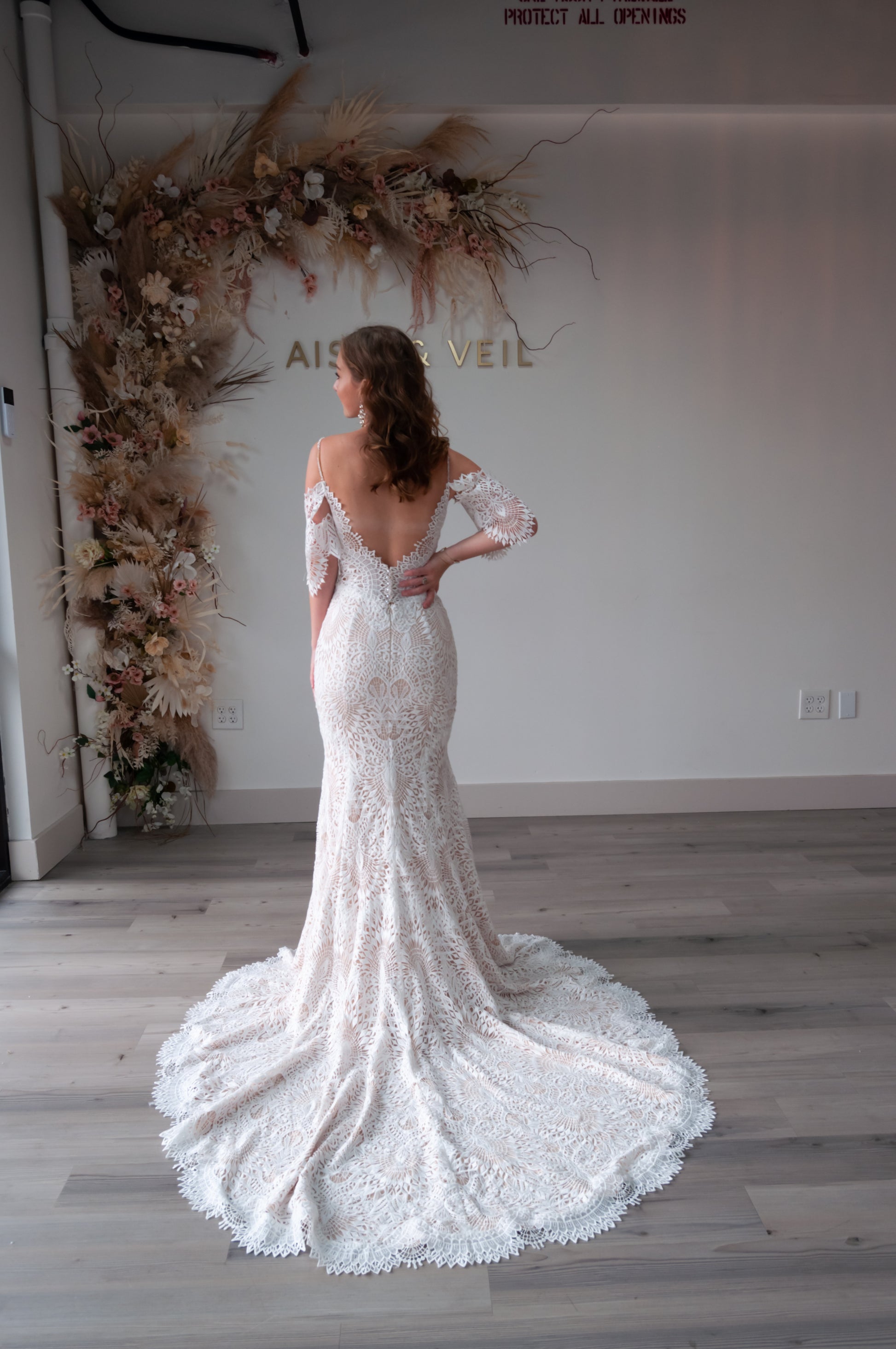 All gowns are authentic designer and private label gowns. While we do our best to take good care for our sample gowns, please note that normal wear & tear is expected. These are in-store samples that have been tried on in-store by brides, but have never been used, worn or altered in any way. Minor fixes and/or cleaning may be expected, however, any major damage will be explicitly stated in the item’s description. If you have any questions prior to purchasing, please reach out to us directly.