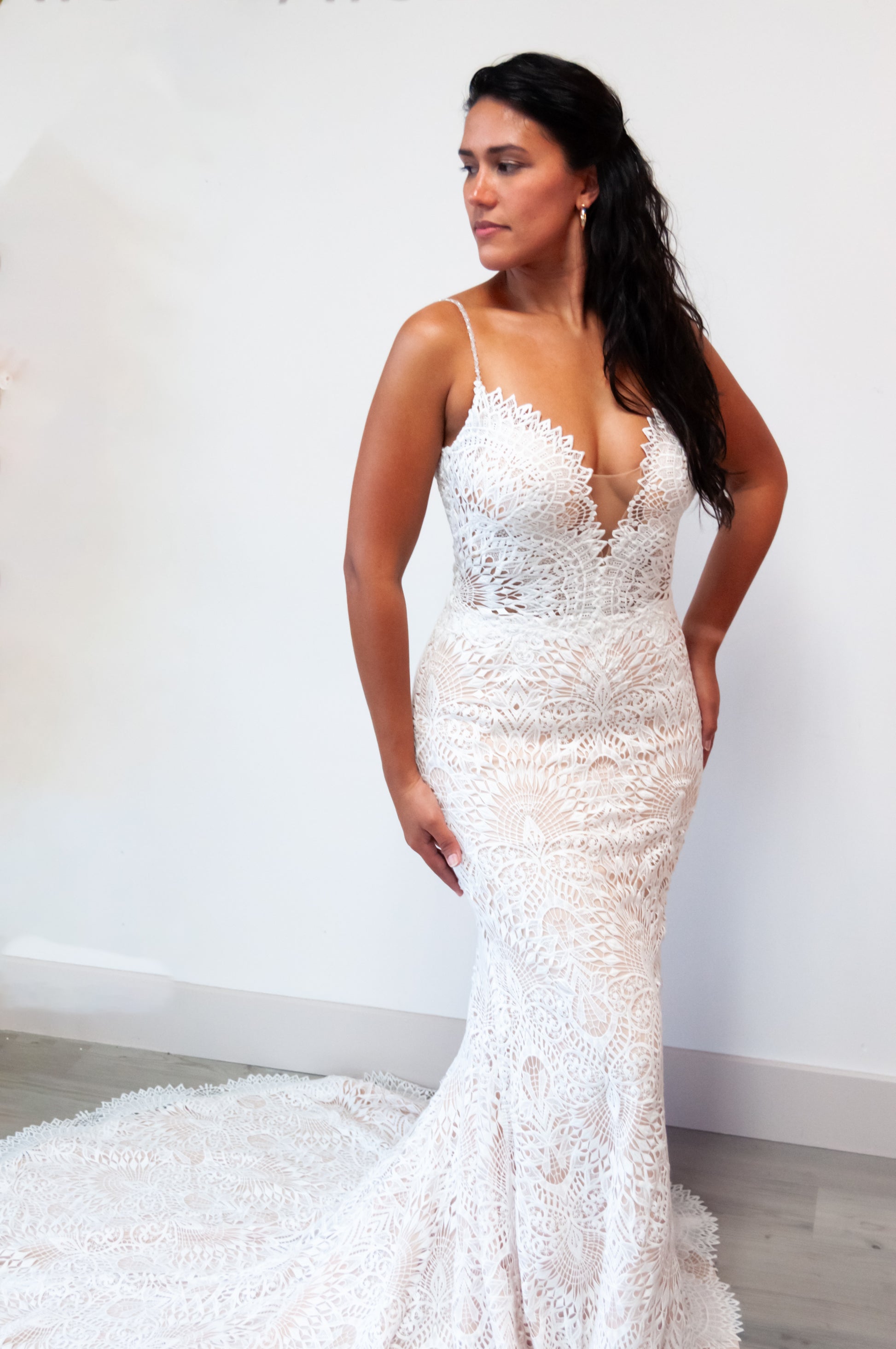 Please note that bridal sizes run small. Your bridal size will usually be several sizes larger than your typical street size, depending on the designer. Please measure yourself and compare it to the designer’s size chart before placing an order. If you are in between sizes, always size up, as you can typically alter a wedding gown 1-2 sizes down in alterations without any structural changes to the gown. Just like any formalwear, alterations are typically necessary for the dress to fit like a glove.