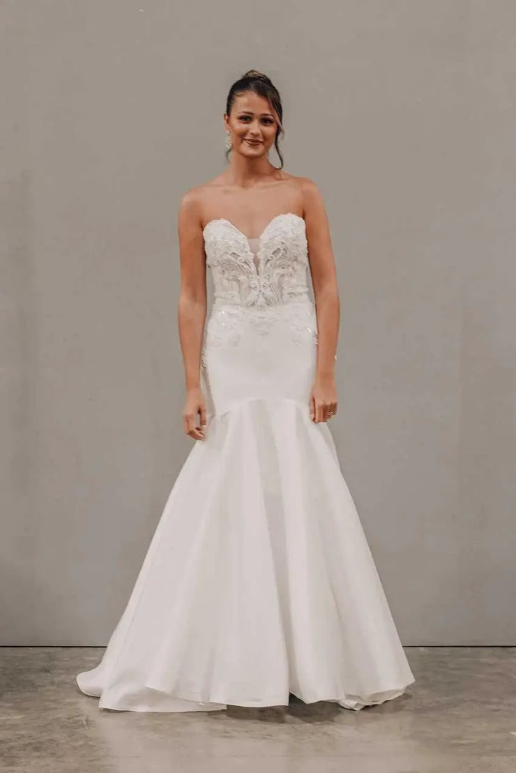 Please note that bridal sizes run small. Your bridal size will usually be several sizes larger than your typical street size, depending on the designer. Please measure yourself and compare it to the designer’s size chart before placing an order. If you are in between sizes, always size up, as you can typically alter a wedding gown 1-2 sizes down in alterations without any structural changes to the gown. Just like any formalwear, alterations are typically necessary for the dress to fit like a glove.
