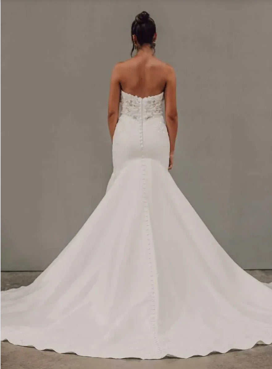 All gowns are authentic designer and private label gowns. While we do our best to take good care for our sample gowns, please note that normal wear & tear is expected. These are in-store samples that have been tried on in-store by brides, but have never been used, worn or altered in any way. Minor fixes and/or cleaning may be expected, however, any major damage will be explicitly stated in the item’s description. If you have any questions prior to purchasing, please reach out to us directly.